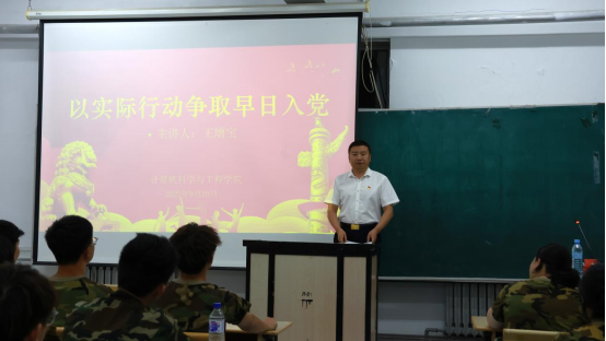 帮助新生系统了解党的历史与宗旨、坚定对党的信念、明晰入党流程与要求,引导他们主动向党组织靠拢,努力为党组织输送信念坚定、素质过硬的青年力量,9月10日晚,计算机科学与工程学院组织2025级新生开展党课教育。学院党总支书记、德育办主任王增宝老师担任主讲,2025级辅导员及全体2025级新生参会。