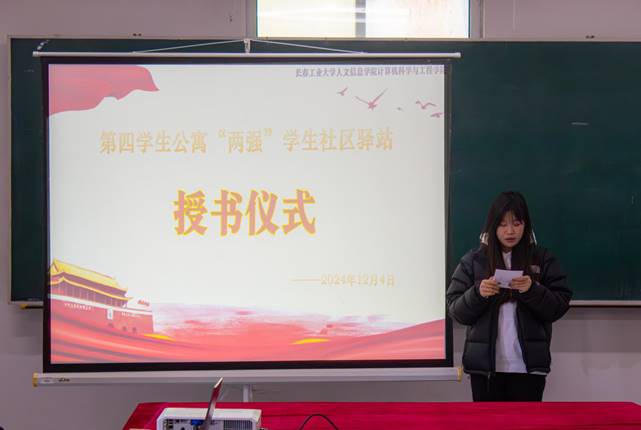 为深入落实党的教育方针,推进全民阅读活动的深化,结合2024年全民阅读民生实事项目进校园系列活动,第四学生公寓“两强”学生社区驿站于2024年12月4日在J1-206举办了读书活动的授书仪式。本次活动由党总支书记、副院长、德育办主任王增宝,团委书记刘莹,以及辅导员王诗童老师等共同策划并担任授书嘉宾。