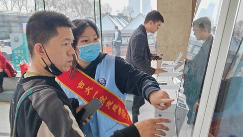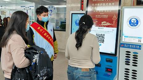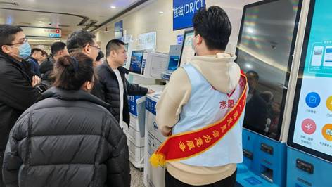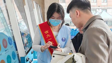 活动过程中,在门诊自助服务区,志愿者们化身“智慧导诊员”,分布在各个自助挂号机前,他们站姿挺拔而专业,目光敏锐地观察着每一位可能需要帮助的患者。他们或俯身指导操作,或轻声解答疑问,或协助选择就诊科室、预约挂号时间,以专业化、流程化的服务为患者搭建便捷就医的桥梁。每当发现有患者在机器前踌躇不前,或是反复尝试操作未果时,志愿者便会主动上前,保持适当的服务距离,用规范的手势和清晰的指引提供帮助。志愿者们还将吉大一院小程序全功能推广给患者,现场演示“吉大一院小程序”核心功能。