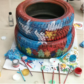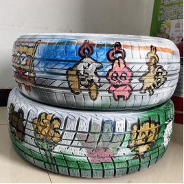参与本次活动的学生志愿者满怀热情与创意,早早来到潭北社区的指定场地集合。社区工作人员提前收集了废弃轮胎,并将其搬运至活动现场。志愿者们分组协作,迅速投入到准备工作中,有的负责清洗轮胎,去除表面的污垢和灰尘;有的则仔细规划设计图案,讨论色彩搭配方案,为即将开始的彩绘工作做足准备。