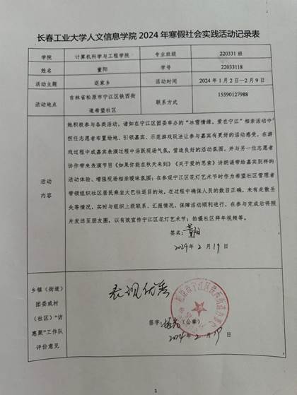 在希望社区作为青年志愿者协助姬光主任工作、抄录会议记录、解决或回答社区居民问题等工作,以自身之力尽可能给予社区工作帮助;在“春风送岗促就业 精准服务助发展 2024年松原市春风行动专场招聘会”中担任志愿者及参与者;拍摄拜年视频等。