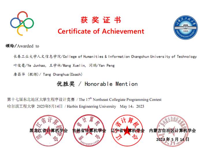 信息工程学院在第十七届东北地区大学生程序设计竞赛中取得好成绩。东北地区大学生程序设计竞赛是由黑龙江省计算机协会、吉林省计算机协会、辽宁省计算机协会以及内蒙古自治区计算机协会联合主办的东北四省程序类最高水平赛事,是面向东北地区高校的程序设计大赛,竞赛成立于2006年,已发展为全国范围高知名度的程序设计大赛,同时也为东北地区各高校选拔优秀的CCPC(即中国大学生程序设计竞赛,China Collegiate Programming Contest, CCPC)竞赛选手和参赛队提供了宝贵的平台。