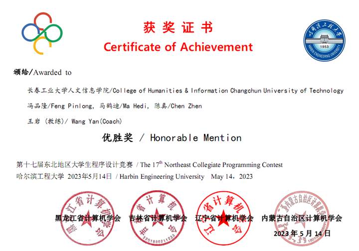本次大赛共有哈尔滨工业大学、吉林大学、哈尔滨工程大学、东北师范大学、哈尔滨理工大学、大连理工大学等四省在内的60多所高校的178个代表队参赛,我院学生是省内唯一一所参赛的民办高校。经过5个小时的激烈角逐,我校学生获得了优胜奖两项的好成绩,名单如下: