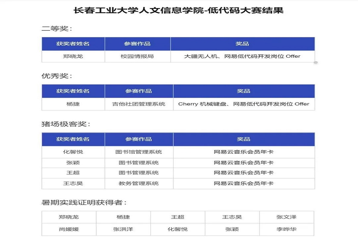 学院不断深化与企业的合作,以改革协同育人模式。我们致力于营造一种“通过竞赛促进学习,通过竞赛促进实践”的学习氛围,以此激发学生的求知欲和对工作的敬业精神。在网易低代码编程大赛中,我院的学生取得了优异成绩,这充分证明了我院积极推动人才培养改革的成效,通过竞赛的形式促进了学生学习能力、协作能力以及创新能力等综合素质的提升。