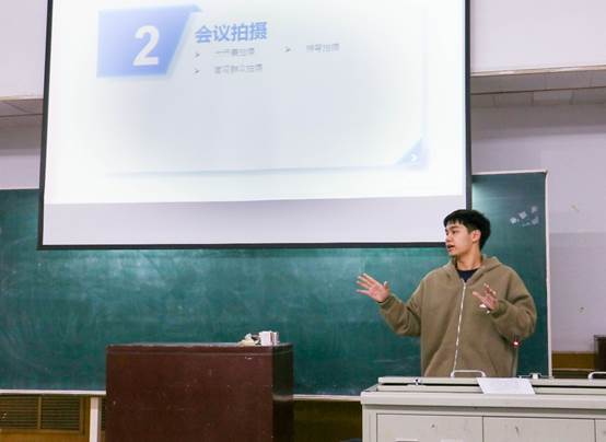 随后,由孙昊同学向我们讲述关于会议以及学院活动的拍摄方法与技巧。他指出拍摄主要分为:大场景拍摄、特写拍摄、客观群众拍摄。他用通俗易懂地语言向同学们介绍了学院新媒体运营部对各个活动拍摄图文的需要以及学院官方公众号的选图要求,并重点讲解了会议类的拍摄技巧。并列举出学院往期公众号图文,进行深刻分析,让同学们对拍摄技巧有了明确理解。