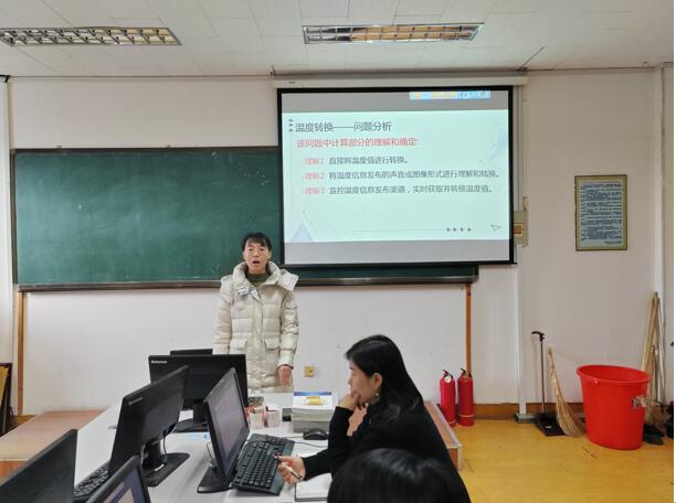 我院新入职教师刘卓林首先试讲了利用Python语言实现华氏温度和摄氏温度的转换问题。刘卓林老师分别从摄氏/华氏温度使用场合、转换公式、代码实现、运行效果展示、知识点扩展等几个角度,熟练的完成了试讲内容。